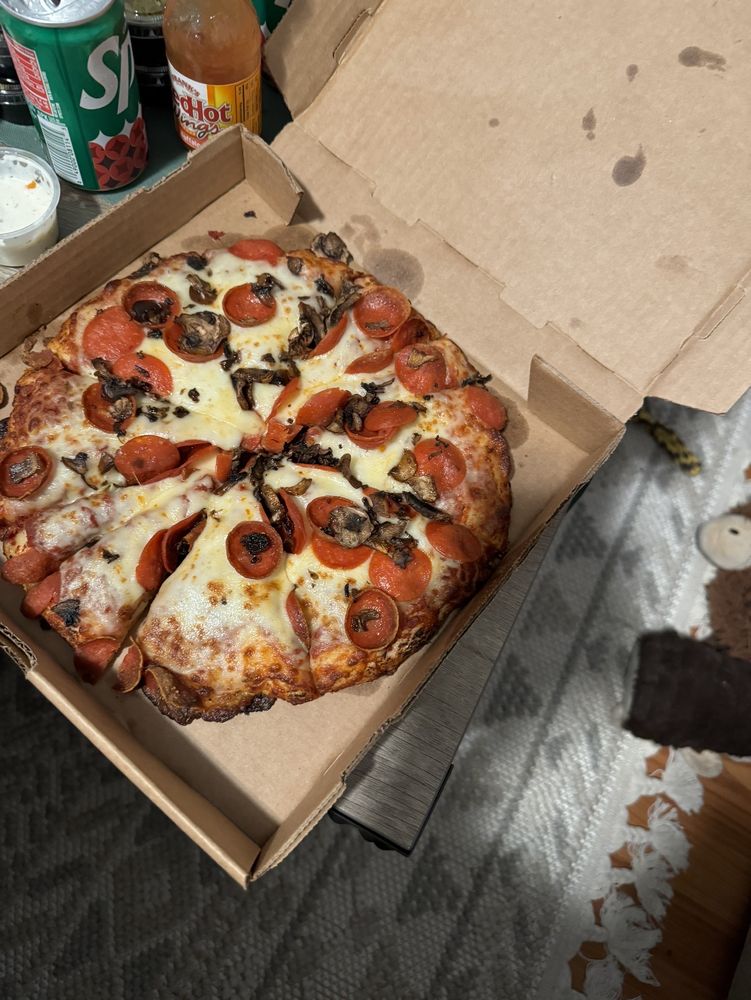 Our fresh pizza dough covered in butter and layered with delicious apple pie filling, brown sugar, and cinnamon. Topped with a dusting of mozzarella cheese and powdered sugar.